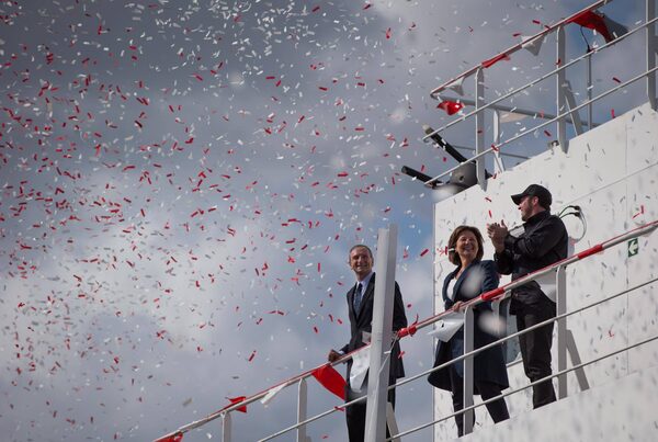 Interim CEO of Seaspan Shipyards Jonathan Whitworth, left, Premier Christy Clark, centre, and executive chairman of Seaspan Kyle Washington were on hand for the commissioning ceremony of two new Seaspan LNG-fuelled vessels in Delta on Sunday.DARRYL DYCK/The Canadian Press