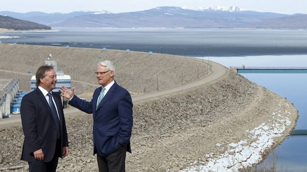 B.C. Premier Gordon Campbell, right, and Brad Bennett, grandson of W.A.C. Bennettt stand in front of the W.A.C. Bennett Dam in Hudson's Hope, B.C. Monday, April 19, 2010. Premier Campbell was in the area to announce the building of a new hydroelectric project named the Site C Clean Energy Project. Site C will use much of the same reservoir and will provide 900 megawatts of capacity and 4,600 gigawatt hours of electricity each year.Jonathan Hayward