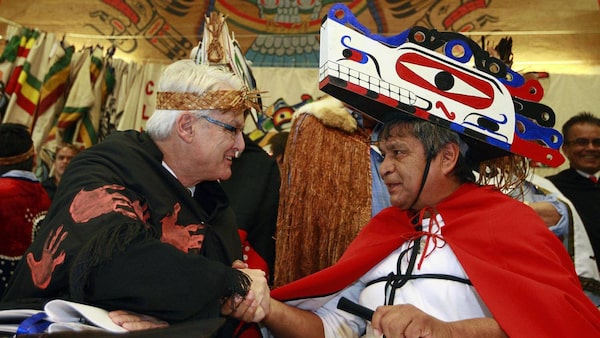 Then B.C. Premier Gordon Campbell shakes hands with Chief Alex Frank during a treaty signing ceremony in Tofino, B.C. November 13, 2008.Globe files