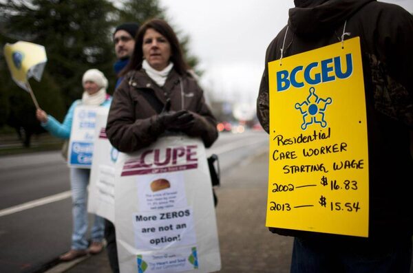 More than 3,000 community living workers who provide care to B.C.'s developmentally disabled picketed outside social-service centres across the province on Wednesday, rallying against wages that make them the lowest paid in the public sector.