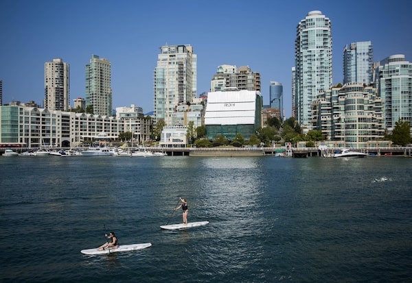 Two women drift across False Creek on stand-up-paddleboards in Vancouver, British Columbia on August 11, 2015. Concord sold a piece of land here more than 20 years ago to be used for charitable, community purposes, but it was put up for sale in May.Ben Nelms/The Globe and Mail