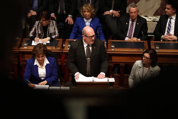 B.C. Finance Minister Michael de Jong delivers a balanced budget for a fifth year in a row at Legislative Assembly in Victoria, B.C., on Feb. 21, 2017.CHAD HIPOLITO/The Canadian Press