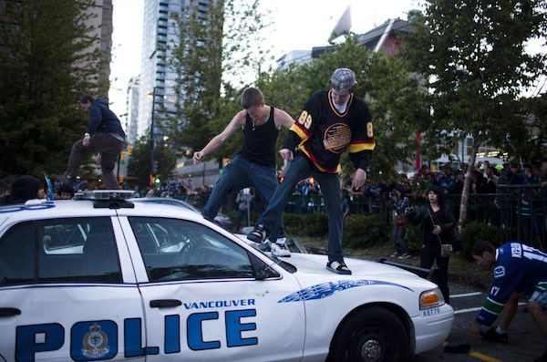 Rioters kick in the windshield of a police cruiser at the corner of Cambie Street and Georgia Street after the Bruins won the Stanley Cup in Vancouver on June 15, 2011.Rafal Gerszak/The Globe and Mail