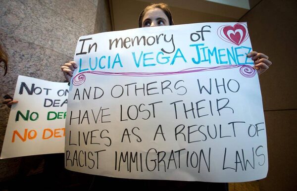 A woman holds a sign before a group of protesters delivered a petition seeking an inquiry into the death of Lucia Vega Jimenez to the Canadian Border Services Agency in Vancouver on Feb. 5, 2014.Darryl Dyck/The Globe and Mail