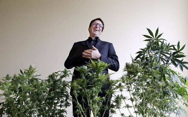 Daniel Curylo laughs while posing with some of the marijuana plants that he uses for marketing purposes in Seattle on Wednesday, Nov. 13, 2013. His goal? A cannabis business park northwest of Olympia that would feature his growing operation, Cascade Crops, as well as retail stores run by his mother, father and aunt.Elaine Thompson/The Associated Press