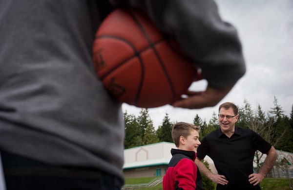 British Columbia NDP Leader Adrian Dix, right, talks with Jack Stuart, the 11-year-old founder of the Jack of Hearts Foundation, who has raised more than $90,000 for diabetes research, after playing basketball during a provincial election campaign stop in Coquitlam, B.C., on April 28, 2013.DARRYL DYCK/The Canadian Press