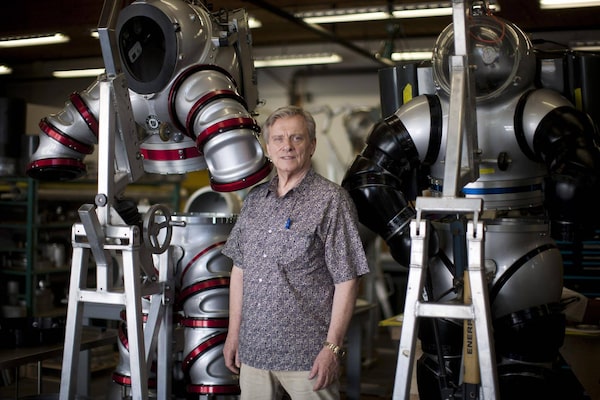 Now he's 73, working out of a small plant in North Vancouver that resembles Tony Stark's work area, with exosuits dangling from hoists. At least five mini subs were seen during The Globe's recent tour through the facility.