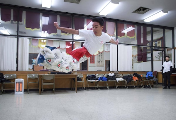 Angus Ing, 17, leaps through the air while practising a lion dance routine for the Chinese New Year Parade, in Vancouver, B.C.DARRYL DYCK/The Canadian Press