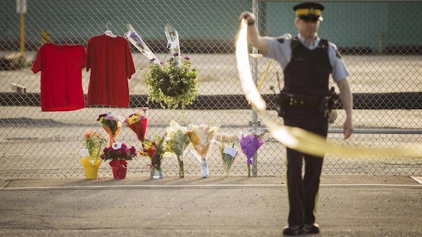Police oversee the scene where four people were shot, two fatally, at a mill in Nanaimo, B.C. Red shirts and flowers left by mourners constitute a makeshift memorial.John Lehmann/The Globe and Mail