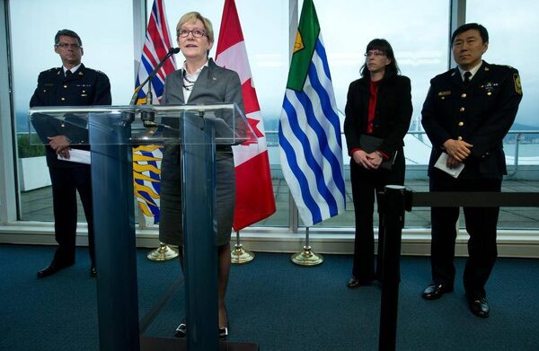 B.C. Minister of Justice and Attorney-General Suzanne Anton announces a $4.9-million compensation fund for children of the victims of serial killer Robert Pickton while Vancouver councillor Andrea Reimer and Vancouver Police Chief Jim Chu listen on March 18, 2014.Darryl Dyck/The Canadian Press