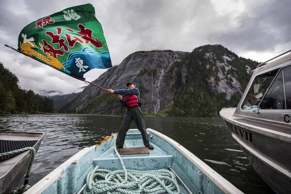 Kou Sasaki proudly waves a ceremonious flag on the first day of fishing in the coastal waters near Klemtu, B.C.John Lehmann/The Globe and Mail