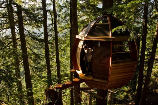 What is now an X on the treasure map of tourists and curiosity seekers began as a somewhat arbitrary goal for Mr. Allen, a former software developer who – after a failed attempt to retire by 26 – became a carpenter, living out of his car. Fuelled equally by necessity, creativity and a love of the outdoors, he decided to build himself a small loft in the woods. Dissatisfied with the clunky beams that hold up traditional tree houses, he began tossing around unconventional ideas with designer friends until one suggested an egg-shaped structure.