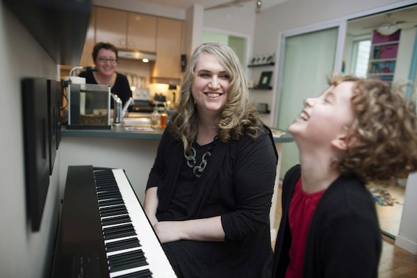 Clayre Sessoms and her seven-year-old daughter, Li, play the piano as her wife, Lisa Sessoms, prepares a snack at their condo in downtown Vancouver, B.C., on Saturday, Dec. 19, 2015.Rafal Gerszak
