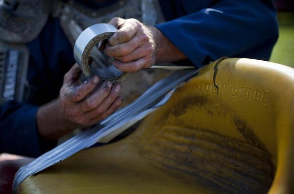 Dan McDonald duct-tapes the seat of his lawnmower.Ben Nelms/The Globe and Mail