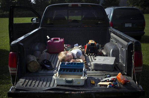 Johny-Ray Sagness, 3, sits in his dad’s truck during a break from the race.Ben Nelms/The Globe and Mail