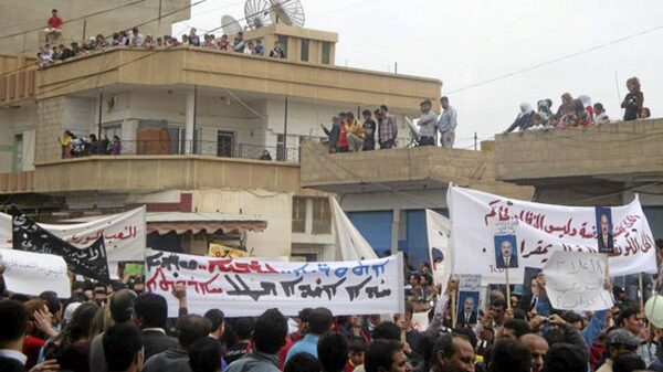 In this citizen journalism image made on a mobile phone and acquired by the AP, Syrian protesters carry banners in Arabic and Kurdish that call for a democratic nation as they demonstrate in the northeastern town of Qamishli, Syria, Friday, April 29, 2011.STR/The Associated Press