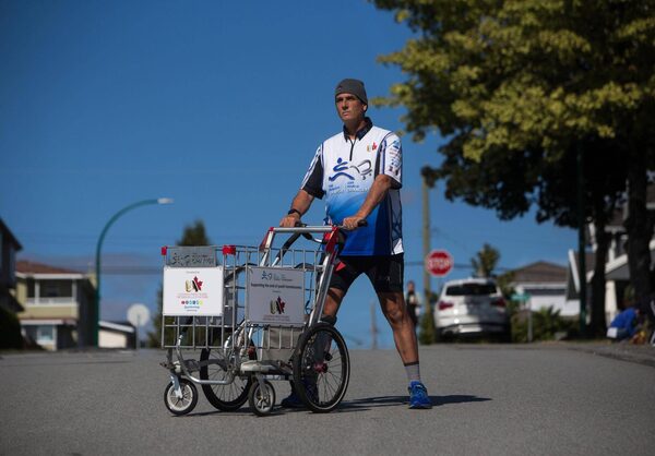 Because his route meant dealing with unpaved highway shoulder in the winter, he worked with Vancouver high-school students to design a cart that uses a more durable baby stroller as its base.