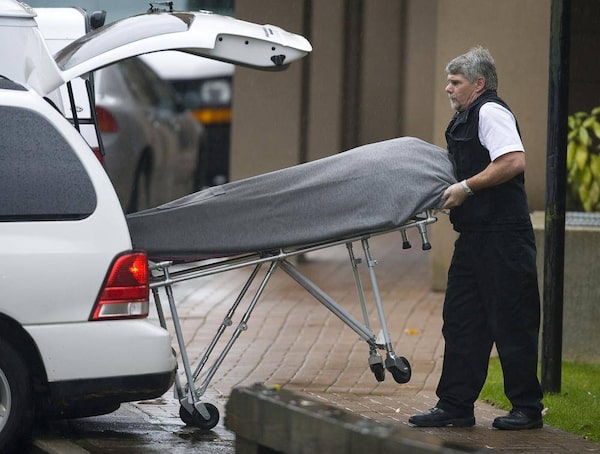 The second of six bodies is removed from the apartment tower where six men were found dead on Oct. 20, 2007, in a Surrey, B.C., high-rise.Jeff Vinnick/The Globe and Mail