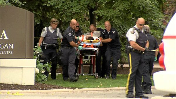 Paramedics assist a man (Jonathan Bacon) who was killed in a gang - related shooting outside a casino in Kelowna, B.C. on Sunday, Aug. 14, 2011.