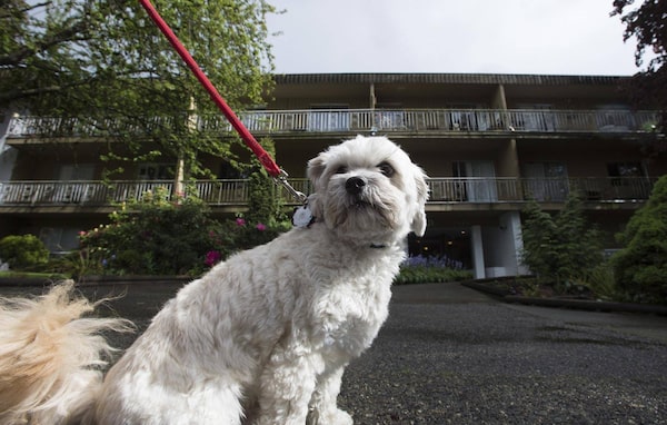 Mustache the dog walks outside a apartment building in Burnaby, B.C. Tuesday, May, 5, 2015.JONATHAN HAYWARD/The Canadian Press
