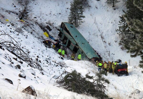 Emergency personnel respond to the scene of a fatal accident where a tour bus careened through a guardrail and several hundred feet down a steep embankment east of Pendleton, Ore., on Dec. 30, 2012.Tim Trainor/The Associated Press
