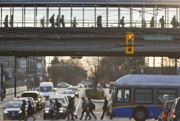 Commuters cross over the road on a pedestrians bridge over Broadway in transit between Skytrains at the Broadway and Commercial Sky Train terminals in Vancouver March 24.JOHN LEHMANN/The Globe and Mail