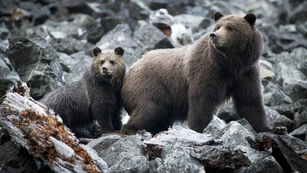 A grizzly bear sow and her spring cub make their way along an old rock slide in the Bella Coola Valley near Tweedsmiur Park Lodge October 8, 2011.John Lehmann/The Globe and Mail