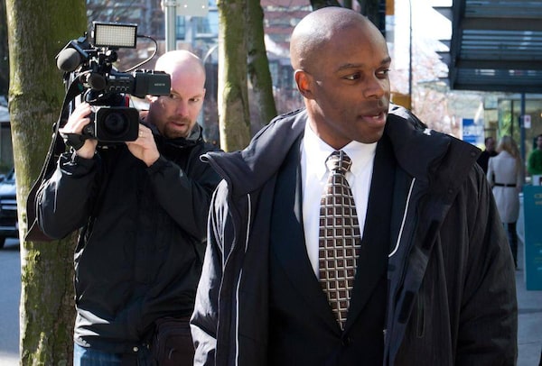 RCMP Constable Kwesi Millington leaves court during a lunch break at his perjury trial in Vancouver on March 10, 2014.Darryl Dyck/The Canadian Press