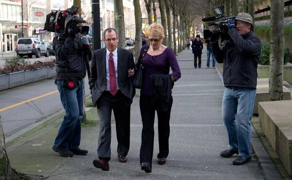 Karen Briker, right, arrives at B.C. Supreme Court to testify at the Queen of the North passenger ferry sinking trial in Vancouver on March 4, 2013.Darryl Dyck/The Canadian Press
