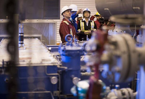 Liberal Leader Christy Clark and Mike Bernier, left, candidate for Peace River, tour an Encana Compressor Site used to gather natural gas and natural gas liquids from natural gas wells in Dawson Creek, B.C., April 18, 2013.John Lehmann/The Globe and Mail
