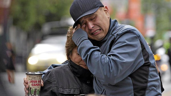 A couple embrace during a protest outside the Missing Women's Inquiry in Vancouver, British Columbia June 6, 2012. The inquiry, which is in its final day of arguments, is probing why it took so long to catch serial killer Robert Pickton, who is believed to have killed more than 20 women before he was arrested in 2002.ANDY CLARK/Reuters