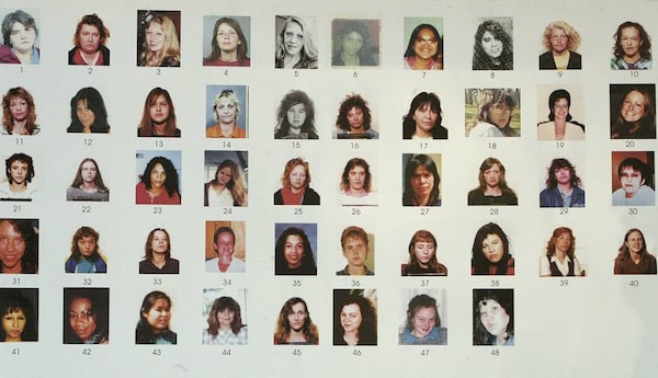 An exhibit from the Pickton trial, a poster board of 48 missing women shown to Pickton during the 11 hours interview on day after he was arrested. Names of those identified in court: #1 Sereena Abotsway; #3 Andrea Joesbury; #4 Mona Wilson; #17 Georgina Papin; #26 Marnie Frey; #48 Brenda Wolfe.JOHN LEHMANN