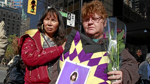 Lori-Ann Ellis (R), mother of Cara Ellis who was murdered by Robert Pickton, is given a memorial blanket in her daghter's memory during a peaceful protest in Vancouver October 16, 2011 in Vancouver.Jeff Vinnick
