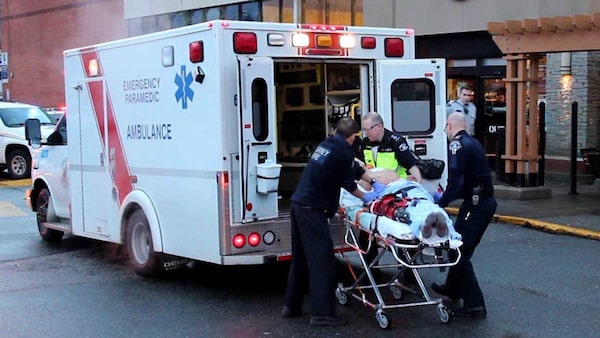A man is loaded into an ambulance after a shooting incident in Surrey, B.C., Sunday, Dec.28, 2014. One man is dead following an officer-involved shooting that is now under investigation by the province's police watchdog.Shane MacKichan