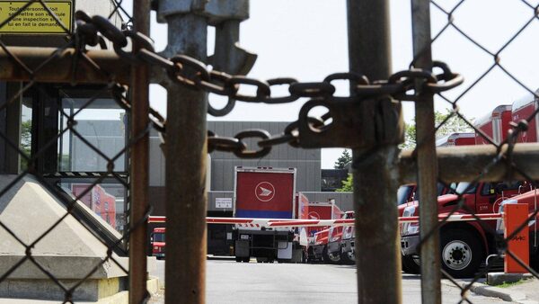 Mail trucks are seen as they are parked behind a chained up fence after the Canadian Union of Postal Workers (CUPW) were locked out at a Canada Post sorting facility in Toronto, June 15, 2011.