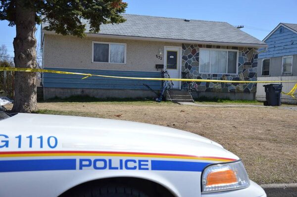 An RCMP vehicle sits outside a crime scene in Prince George, B.C.