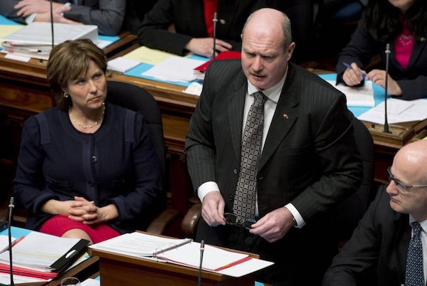 Premier Christy Clark, left, looks on as B.C. Finance Minister Mike de Jong tables the budget in the B.C. Legislature in Victoria, on Feb. 19, 2013.Jonatan Hayward/The Canadian Press