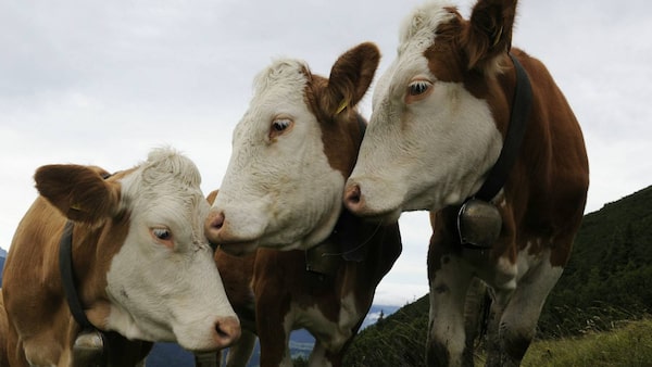Cows graze on a meadow near the mountain shelter Weilheimer Huette in the Alps mountains near the village Oberau, southern Germany, during nice weather with temperatures by 20 degrees, August 14, 2010.CHRISTOF STACHE
