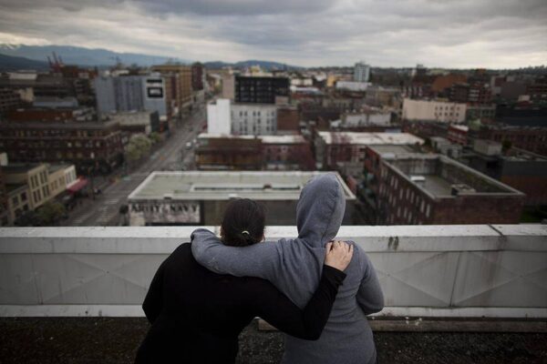 Downtown Eastside resident Teresa Baillie, left, and a staff member look out over the Downtown Eastside from the rooftop of the Tellier Tower in Vancouver on April 2, 2013.Rafal Gerszak/The Globe and Mail