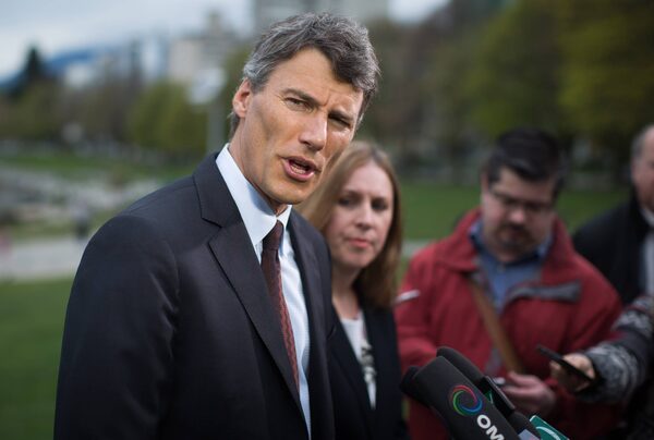 Vancouver Mayor Gregor Robertson speaks during a news conference at English Bay in Vancouver, B.C., on Friday April 10, 2015, after bunker fuel began leaking from a bulk carrier cargo ship Wednesday.DARRYL DYCK/The Globe and Mail