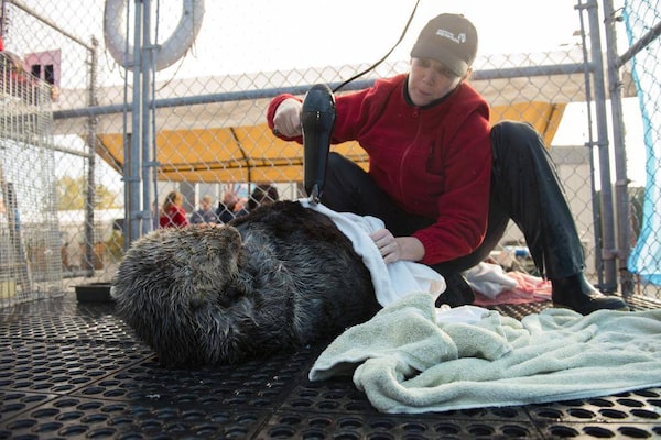 Lindsaye Akhurst, Vancouver Aquarium marine mammal rescue manager, blow-dries and grooms an injured sea otter after medical procedures.Neil Fisher