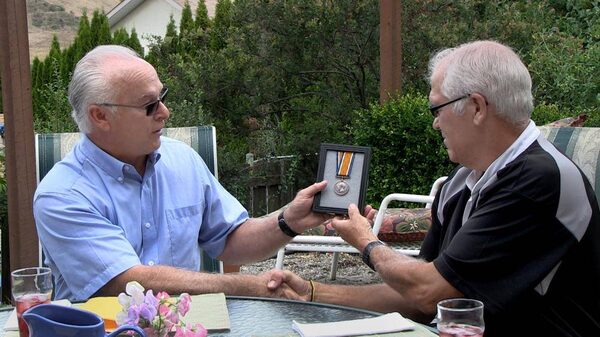 Although Lance-Cpl. Rutter's mother was given the medal in 1920, it somehow crossed the Pacific and ended up among the possessions of the father of Douglas Goldthorp of Bellingham, Wash. Mr. Goldthorp travelled to Coldstream to deliver it to Mr. Rutter on July 25.
