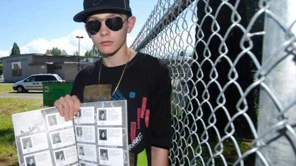 Brandon Armstrong poses with his yearbook next to a fence at his school. Brandon's photo and quotes were cut out of his high school's yearbook in Courtenay BC.
