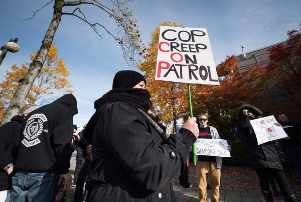 A woman hiding her face holds a sign as members of the vigilante group Surrey Creep Catchers and their supporters gather outside B.C. Provincial Court at a scheduled court appearance for RCMP Const. Dario Devic, who was charged with luring a child after the group alleged a man was trying to solicit an underage girl for sex, in Surrey, B.C., on Wednesday October 19, 2016.DARRYL DYCK/The Canadian Press