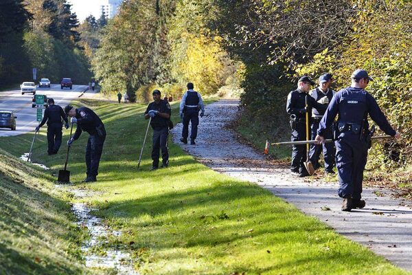 RCMP officers, police from local detachments and Surrey city workers comb the brush along a roadway in the Green Timbers Urban Forest on Oct. 23, 2007, as they search for evidence near a building where six men were found dead in Surrey, B.C.Jeff Vinnick/The Globe and Mail