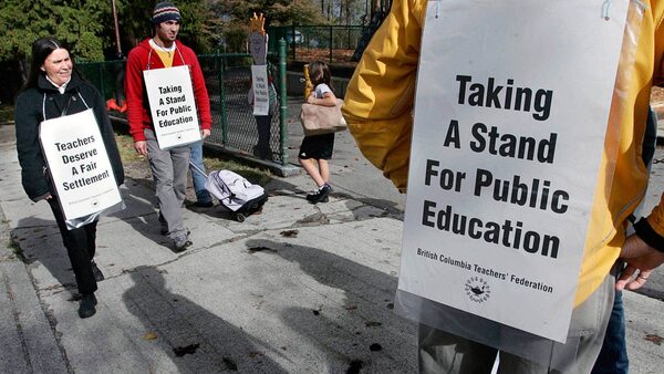 British Columbia teachers picket outside a school in Vancouver after going out on strike October 7, 2005. Some 42,000 teachers across the province walked off the job to protest against a government imposed contract and wage freeze.Andy Clark/ Reuters