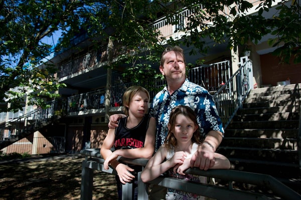 Guy Wakeman with son Walker, left, 11, and his daughter Hannah-Lynn, 7, outside their home at the Stamps Place social housing complex in the Downtown Eastside of Vancouver, B.C., on Tuesday August 18, 2015.Darryl Dyck/The Globe and Mail