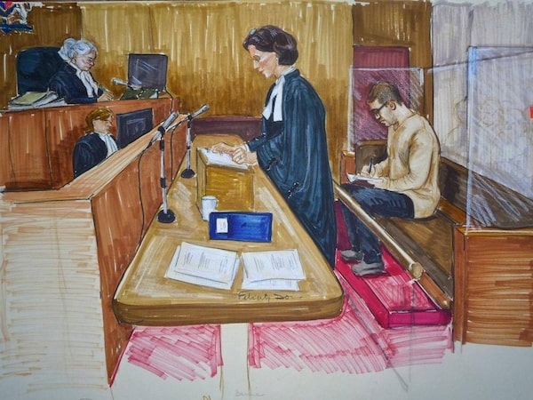 Crown lawyer Damienne Darby addresses the court while the accused, 29-year-old Reza Moazami, writes in the prisoner's box in this court drawing.Felicity Don/The Canadian Press