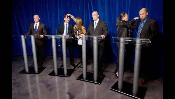 British Columbia NDP leadership candidates Mike Farnworth, from left, Adrian Dix, John Horgan and Dana Larsen await the start of a taping of a television debate