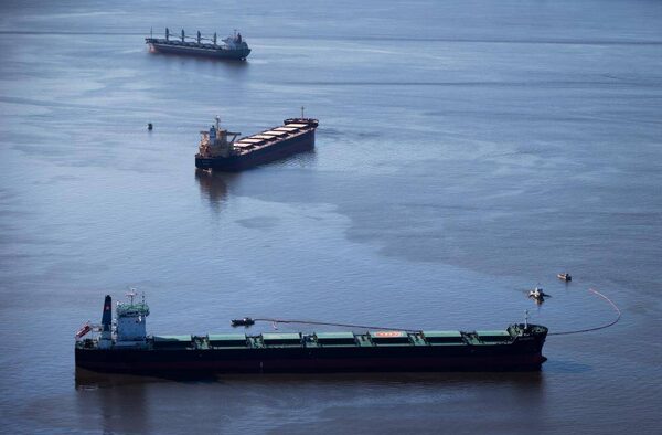 Spill response boats work to contain bunker fuel leaking from the bulk carrier cargo ship Marathassa, second from top, anchored on Burrard Inlet in Vancouver, B.C., on Thursday April 9, 2015.DARRYL DYCK/The Canadian Press